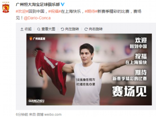 北京时间1月28日,上海上港官方宣布孔卡加盟,作为孔卡的老东家,广州恒大也在第一时间欢迎孔卡回到中国,他们在官方微博中写道:“欢迎回到中国,祝福在上海快乐,期待新赛季精彩的比赛,赛场见!@Dario-Conca。”