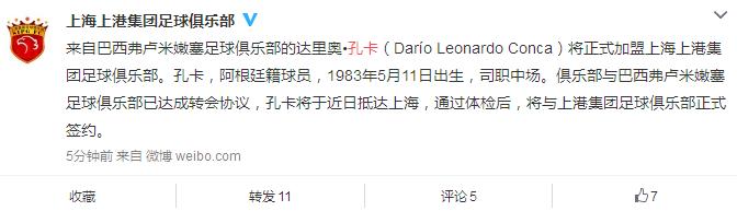 上港官方宣布孔卡加盟 近日来沪体检后正式签约