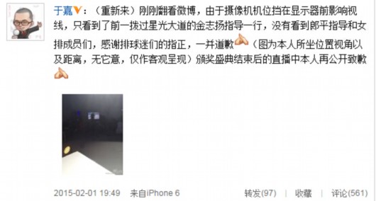 北京时间2月1日晚,2015年CCTV体坛风云人物年度颁奖盛典正在举行。在红地毯环节,由于主持人于嘉没有播报中国女排的入场,他在微博上正式道歉称:“摄像机机位挡在显示器前影响视线,没能看到郎平指导和女排成员们。”