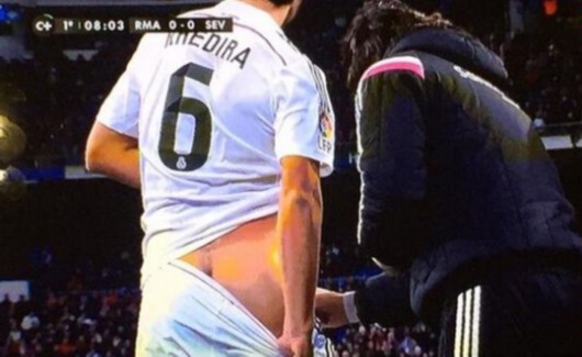 中国的球迷看不到这一幕,不过canal+位于皇马右路的摄像机,抓到这“香艳”的画面。或许,球迷会想起著名动漫人物蜡笔小新,他的招牌之一便是光屁股。有球迷在推特上调侃,赫迪拉的女友蕾娜是德国太太团的最性感美女,是爱抛胸露臀的名模,赫迪拉也和女友一起加入这个行列。