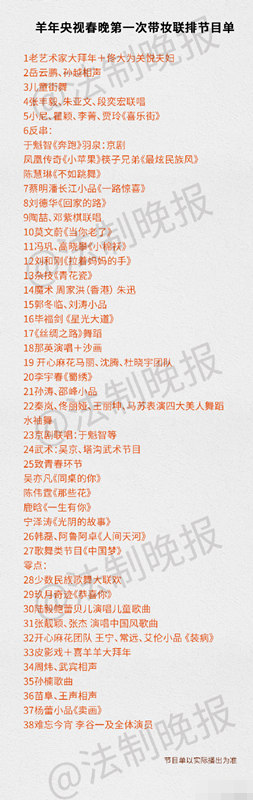 昨天下午,央视羊年春晚首次带观众联排。李宇春、鹿晗、陈伟霆等都现身彩排现场。而春晚的最新节目单也随之曝光。