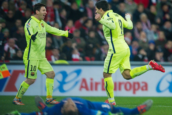 图片说明:梅西、苏亚雷斯庆祝