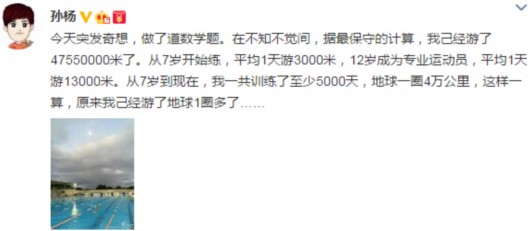 北京时间2月10日,正在澳大利亚训练的孙杨似乎成熟了不少,经常在微博上晒出自己的人生感悟。昨天,孙杨开始做起了数学题,自己估算出开始游泳训练以来的训练量。