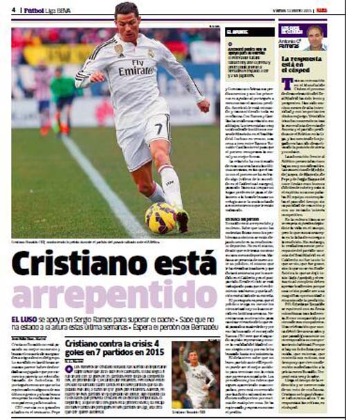 C罗公开道歉了?才没有呢。本周五出版的《马卡报》当了一回封面党。没有向球迷,没有向教练,也没有向全体队友,葡萄牙人并没有公开道歉,只是在私下里向与自己关系比较好的几位队友,比如说佩佩与科恩特朗表达了自己的懊恼,表示自己可能犯了些错误,并认为最好的道歉就是将全部精力集中到球场上,最好的获取宽恕的方式就是找回状态,不断进球。