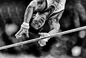 贾国荣说自己用了别人很少用的600mm镜头,用减法拍摄运动员杠上争锋的局部特写,尽量去掉一切干扰画面的因素。