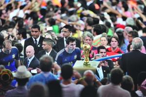 只能在看台上的鲍泰良,眼神放在领取金球奖的梅西身上。梅西两次经过大力神杯,第一次没有看,第二次却盯着大力神杯看了一会。虽然面无表情,但是从梅西深邃的眼神中,所有人都能读出他心中的不甘和渴望。