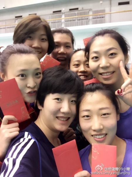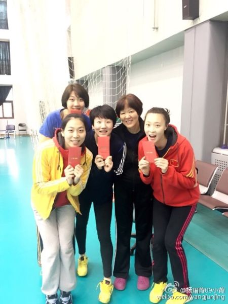 朱婷回家要火车转汽车,车程需要八、九个小时,因此被特批今天上午不练提前离队,曾春蕾也因为有重要任务提前离队。余下19人在欢快的气氛中完成了今天上午的身体训练,包括郎导和姑娘们全体女排将士都拿到了队里派发的新年红包,带着祝福和喜悦收拾行囊回家。姑娘们喜气洋洋地合影留念,展示了自己的“大红包”。大部分队员选择回家与父母团聚,也有球员的父母来北京与女儿共度春节。