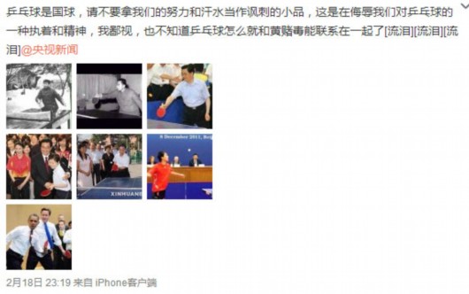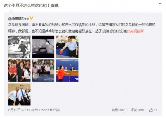 北京时间2月19日消息,2015年羊年央视春晚,开心麻花成员沈腾、马丽和杜晓宇的小品《投其所好》涉及反腐内容,暗讽拍领导马屁的现象。不过小品中的一句台词“拒绝黃拒绝赌拒绝乒乓球”引发争议,节目播出后,包括王皓在内的众多乒乓球名将表达了不满。前辽宁乒乓球队员、福原爱私人教练汤媛媛发微博称:“乒乓球是国球,请不要拿我们的努力和汗水当作讽刺的小品,这是在侮辱我们对乒乓球的一种执着和精神,我鄙视,也不知道乒乓球怎么就和黄赌毒能联系在一起了”