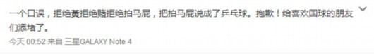 随后,小品表演者之一沈腾发微博解释说这是口误,“一个口误,拒绝黃拒绝赌拒绝拍马屁,把拍马屁说成了乒乓球。抱歉!给喜欢国球的朋友们添堵了。”