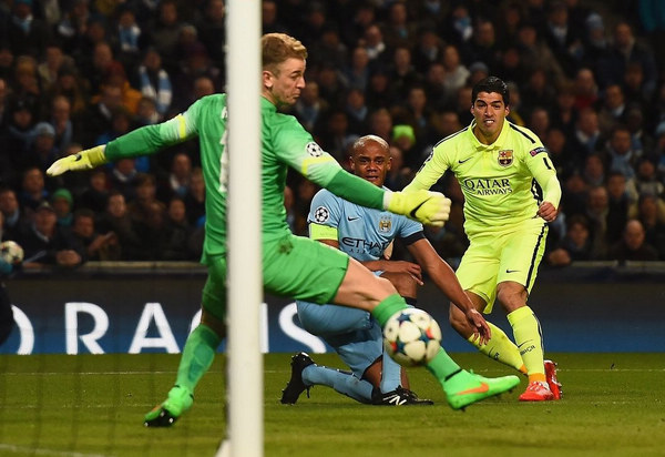 北京时间2月25日凌晨3点45,2014-15赛季欧冠1/8决赛首回合,10人曼城主场1-2不敌巴萨,苏神梅开二度,梅西送助攻但罚丢点球,阿圭罗扳回一分。