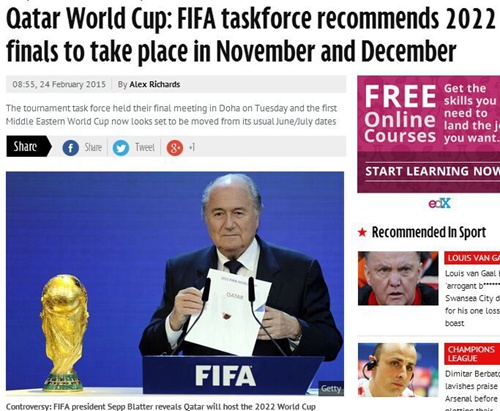 考虑到卡塔尔夏季的环境,通常的6月份和七6月份是无法举办世界杯的,如果想在这个国度举办世界杯,就必须另择时间。北京时间2月25日,英国媒体《镜报》消息称,关于2022年卡塔尔世界杯,国际足联已经决定将举行时间定在11月份和12月份,这项提议已被多数代表赞成,国际足联秘书长瓦茨克表示,这是2022年卡塔尔世界杯唯一可行性的方案。据悉,国际足联已经决定在下个月将讨论2022年卡塔尔世界杯在11月份和12月份举办的方案,若不出意外的话,这一方案将顺利通过。