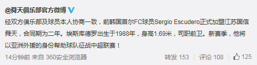 经双方俱乐部及球员本人协商一致,前韩国首尔FC球员Sergio Escudero正式加盟江苏国信舜天,合同期为二年。埃斯库德罗出生于1988年,身高1.69米,司职前卫。新赛季,他将以亚洲外援的身份帮助球队征战中超联赛!