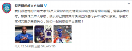 舜天官方宣布埃雷尔森韧带断裂 将返回巴西接受手术