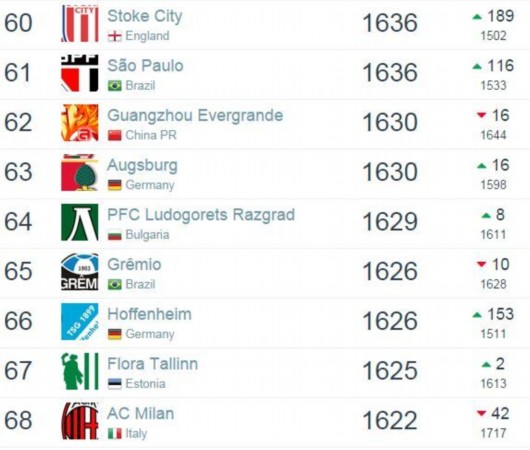 在世界俱乐部排名总榜中,广州恒大以1630个积分稳居亚洲第一,排名较上周再次上升两位,位列世界第62位。其中值得一提的是,意甲豪门AC米兰队仅仅位列第68,落后广州恒大六位之多。此外,在排名落后广州恒大的球队中还包括阿甲冠军竞技俱乐部、西甲劲旅皇家社会和土超豪门贝西克塔斯等。