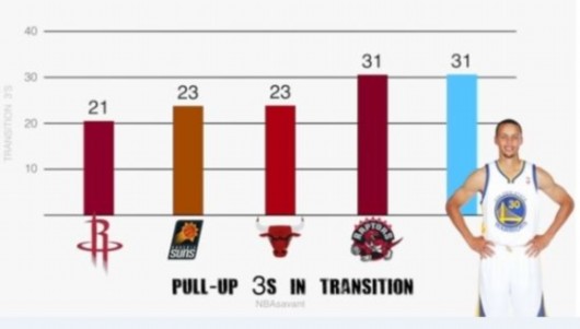 篮球术语里有个词叫Pull-up,意思就是持球人面对贴身防守跳起投篮,也就是中国球迷俗称的干拔投篮。据统计,库里本赛季在攻防转换中(单次进攻时间等于或少于5秒)命中的干拔三分球数已经达到31个,这个数字是什么概念?他不仅是联盟个人的最高水准——排第二的是洛瑞的14个、而威少和欧文以13个并列第三,而且跟NBA球队本赛季的最高水平猛龙持平,换个角度,步行者(2个)、热火(3个)、爵士(6个)、奇才(8个)和森林狼(9个)五支球队加起来,个数也比库里一个人少。