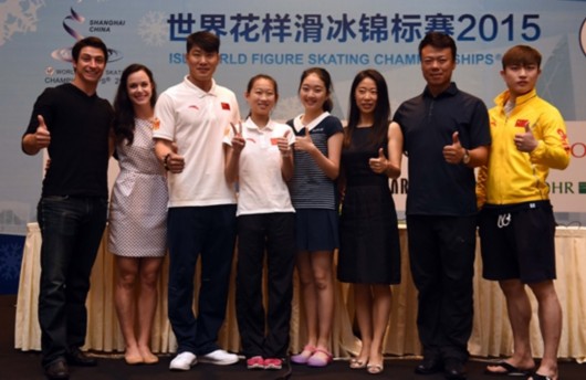去年7月28日,申雪/赵宏博(图右三、二)领衔多位冰上大牌明星参加官方发布会,预示着花滑世锦赛正式进入“上海时间”。