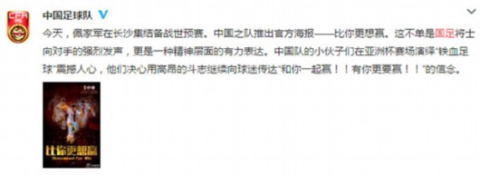 中国足球队在官方微博中写道:“今天,佩家军在长沙集结备战世预赛。中国之队推出官方海报——比你更想赢。这不单是国足将士向对手的强烈发声,更是一种精神层面的有力表达。中国队的小伙子们在亚洲杯赛场演绎“铁血足球”震撼人心,他们决心用高昂的斗志继续向球迷传达“和你一起赢!!有你更要赢!!”的信念。”