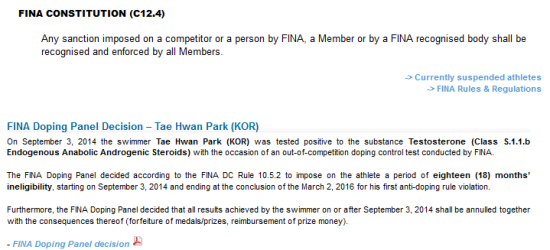据外媒报道,这场决定昔日韩国民族英雄命运的听证会持续了四个多小时,随后在国际泳联的官方网站上公布了对他的处罚结果:根据国际泳联反兴奋剂相关条例10.5.2,决定对朴泰桓做出为期18个月的禁赛,禁赛时间从2014年9月3日开始到2016年3月2日结束。