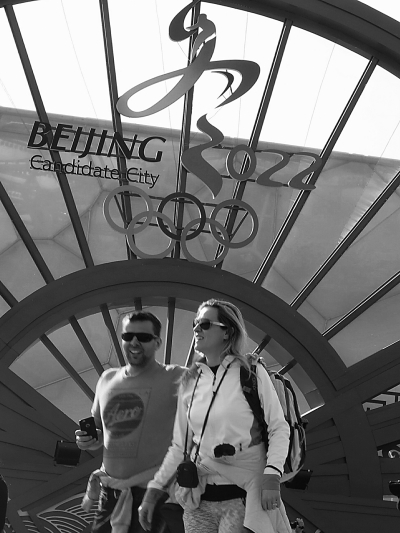 3月24日,一对海外游客途经水立方外的北京申冬奥标识。光明日报记者郭红松摄