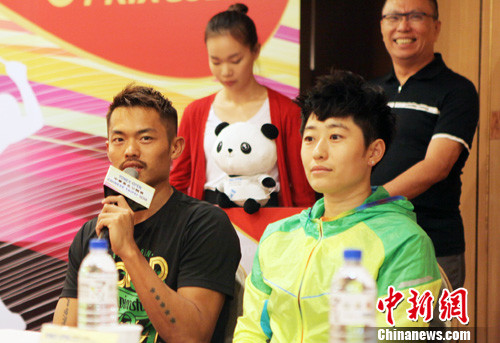 资料图 2014年7月14日,大陆名将林丹(前左)、于洋(前右)在台北出席“2014中华台北羽球公开赛”赛前记者会。中新社发 黄少华 摄