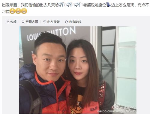 杨威在微博中说道,“出发希腊,我们偷偷的出去几天哈。老婆说她座位边上怎么是我,有点不习惯。”