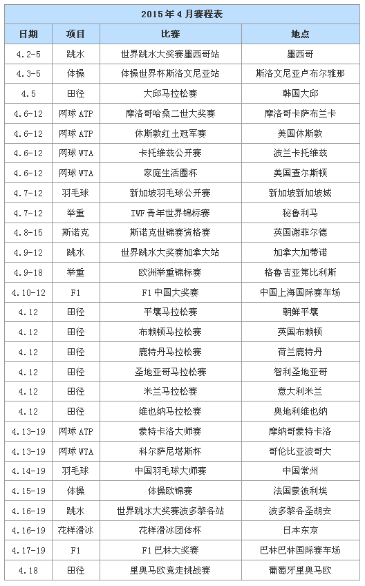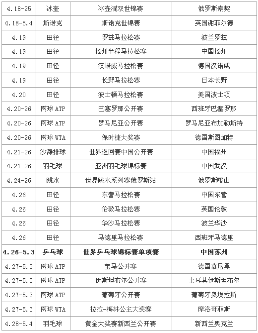 四月将迎来斯诺克的重要赛事——斯诺克世锦赛,奥沙利文、丁俊晖等名将再次齐聚克鲁斯堡,向冠军发起冲击。此外,时隔10年后再返中国的世界乒乓球锦标赛单项赛将于4月26日在苏州开拍,作为东道主的中国军团势将全力将全部金牌留在中国。
