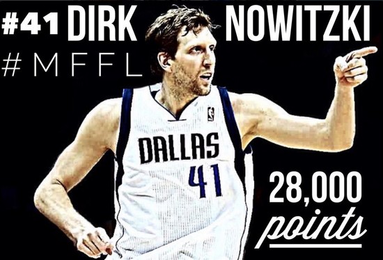 本场之前,德克距离28000分还差14分。一直用自己得分记录开玩笑的他似乎也憋足了劲要在这场破掉记录。上半场结束前,德克罕见地连续三次高位要球,强行出手全部命中,上半场他就拿下了11分。而在下半场开始不久后,德克接到埃利斯突破分球,在正面弧顶偏左侧接球,迎着麦加里高举的双手,强行出手三分命中,这也让他拿下了生涯的第28000分。