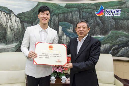 图片说明:杨雄为刘翔颁发上海市人民政府奖状 (张春海 摄)