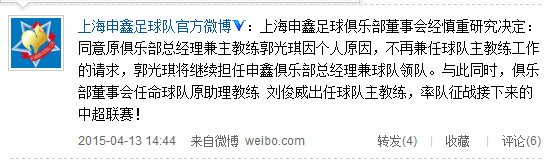 “上海申鑫足球俱乐部董事会经慎重研究决定:同意原俱乐部总经理兼主教练郭光琪因个人原因,不再兼任球队主教练工作的请求,郭光琪将继续担任申鑫俱乐部总经理兼球队领队。与此同时,俱乐部董事会任命球队原助理教练刘俊威出任球队主教练,率队征战接下来的中超联赛!”
