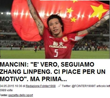 尽管此前意大利媒体报道称由于恒大要价过高,国际米兰已经放弃了张琳芃的引进工作,但国米主帅曼奇尼在接受采访时候却表示,张琳芃仍是国米的目标之一。