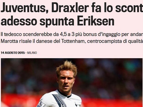北京时间8月14日,据意大利《米兰体育报》消息,在追求德拉克斯勒遇阻的情况下,尤文图斯目前计划改挖热刺组织核心埃里克森,近2个赛季,丹麦中场在英超的发挥渐入佳境,这名热刺核心目前有望在今夏转战尤文。