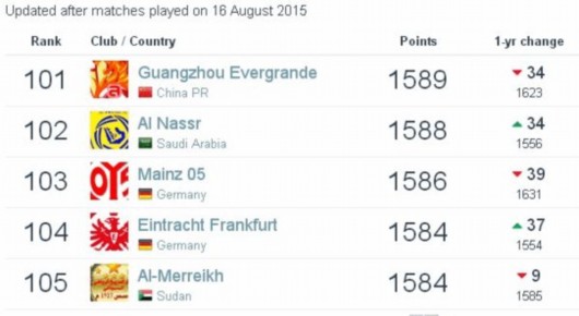 世界俱乐部排名:恒大下滑6位 国安返亚洲前20