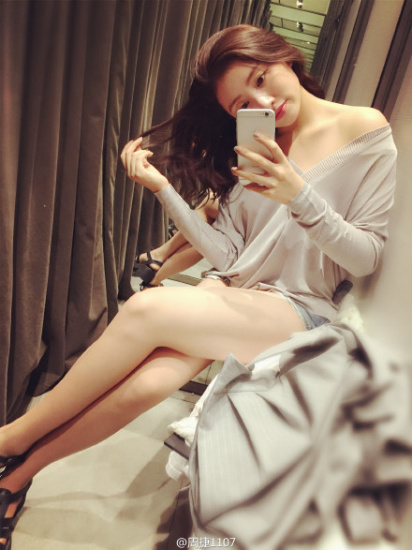 昨天晚上,艺术体操名将周捷在微博中晒出一张自拍美照。照片中她身处某品牌试衣间,右手轻轻撩动发梢,V领线衣露出香肩,身着超短牛仔裤大秀白皙美腿。