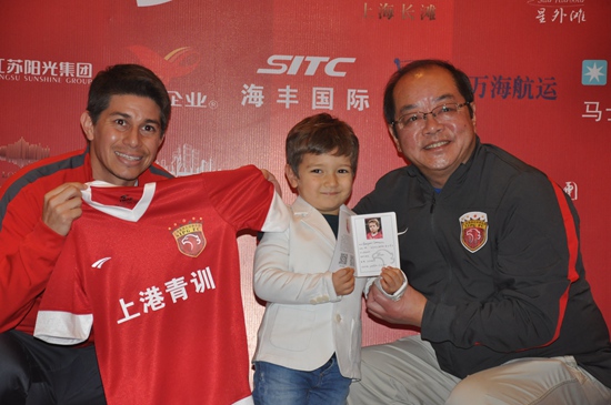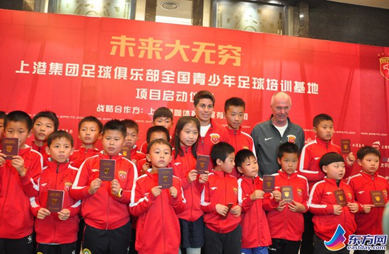 东方网记者成昭远报道:11月14日下午,上港集团足球俱乐部“未来大无穷”全国青少年足球培训基地项目启动仪式在上海富豪环球东亚酒店举行。上港集团足球俱乐部总经理隋国扬、上港队主帅埃里克森、外援孔卡以及合作方总经理郭伟等出席启动仪式。