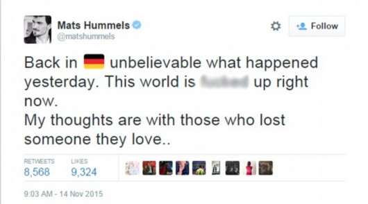 德国队安全归国 铁闸爆粗口:世界都XX被搞糟了 德国当地时间11月14日上午9时左右,德国国家队乘飞机从法国飞抵法兰克福机场。在巴黎当地时间11月13日晚的爆炸案中,结束了同法国队比赛的德国球员,并没有离开球场,而是在球场中度过了一晚,并于早间在安保人员护送下奔赴机场。中后卫胡梅尔斯发布推特说道:“回到德国了,难以相信昨天发生了什么,世界现在已经被XXX的搞糟了,我的心绪同那些失去所爱的人们在一起……”