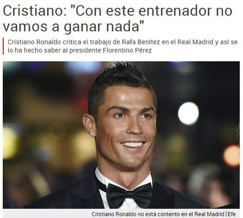 贝尼特斯执教皇马不到半年就已经惹怒了队内众大佬,拉莫斯、本泽马等人都对皇马主帅非常不满。《机密报》透露:和贝尼特斯关系已经破裂的C罗已经通知弗洛伦蒂诺,这样的教练执教银河战舰,赛季末皇马将颗粒无收。