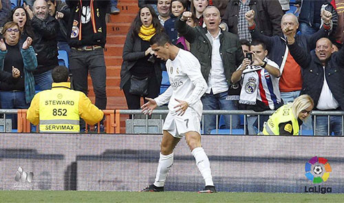 在上轮联赛对阵埃瓦尔的比赛中,C罗运动战运气欠佳,最终只依靠1粒点球才完成破门。今夜在主场,C罗在锋线上能传擅射,不仅帮助皇马主场上演进球表演,还轻松超越了乌戈-桑切斯的进球神迹。