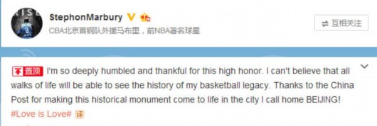 “I'm so deeply humbled and thankful for this high honor. I can't believe that all walks of life will be able to see the history of my basketball legacy. Thanks to the China Post for making this historical monument come to life in the city I call home BEIJING!(对如此高的荣耀,我感到受宠若惊。难以相信在一路走来后能够看到我自己的篮球传奇。感谢中国邮政能够在北京——这个我成为家的地方,建造了这一历史性的丰碑。)”马布里在个人社交媒体中写道。