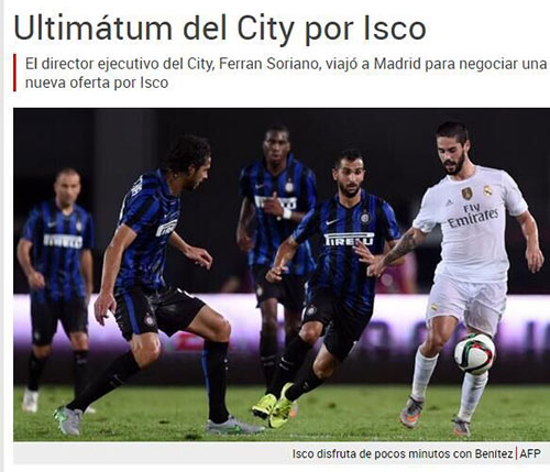 不过皇马可以用伊斯科作为转会交易的一部分,另外再加上一笔转会费来努力完成收购阿圭罗的交易。《每日体育报》表示:曼城CE0索里亚诺已经在马德里与皇马CEO桑切斯完成会晤,目的就是商讨伊斯科的转会。