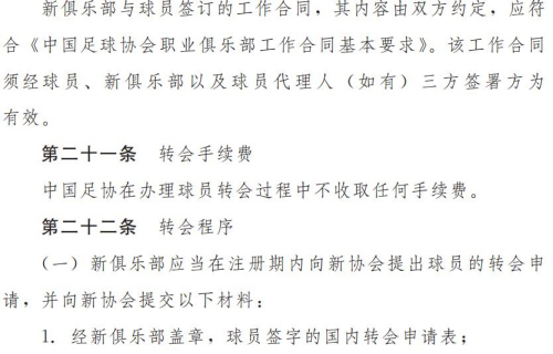 东方网12月30日消息:今天傍晚,足协通过官方网站上发布了“中国足协关于下发《中国足球协会球员身份与转会管理规定》的通知”。其中,第二十一条规定,足协在办理球员转会过程中,不收取任何手续费。