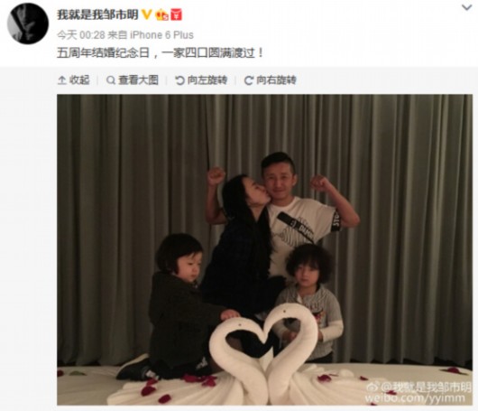 邹市明在微博中写道:“五周年结婚纪念日,一家四口圆满渡过!”网友纷纷点赞,更有人欣羡称他是“人生大赢家”。