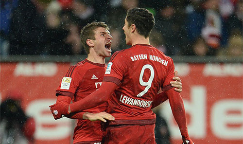 北京时间2月15日凌晨0时30分,2015-16赛季德甲第21轮最晚进行的一场较量,领头羊、卫冕冠军拜仁慕尼黑做客WWK球场3-1击败联赛排名第14位的奥格斯堡。第15分钟,莱万禁区内转身射门得手。第62分钟,蒂亚戈精妙直塞,莱万单刀推射远角扩大领先优势。第78分钟,科斯塔助攻,穆勒锁定胜局。第85分钟,博巴迪利亚攻入挽回颜面的一球。