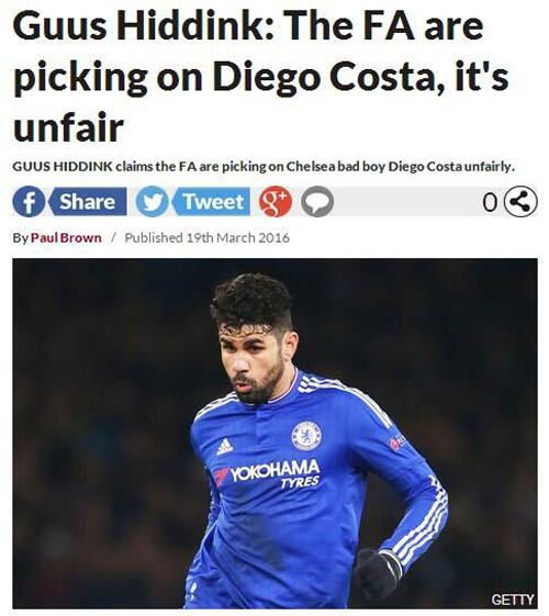 原标题: 希丁克:英足总针对科斯塔不公平 以后不再执教