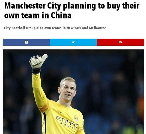 去年12月,英超豪门曼城官方宣布,中国华人文化投资基金将联合中信资本出资4亿美元收购曼城俱乐部母公司城市足球集团(英文名City Football Group,简称CFG)13%的股份。在英国媒体看来,这揭开了曼城开拓中国市场的大幕,今天的《太阳报》则指出,城市足球集体打算收购一支中国球队,并且命名为上海FC,这说明上海上港和上海申花两支劲旅中的一支可能纳入曼苏尔的足球版图。