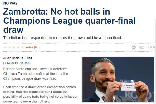 有人指出欧足联可能在抽签的球上做了手脚,用冷热不同的温度来诱导抽签嘉宾抽出预先设定好的抽签结果。但是赞布罗塔则表示:“我对天发誓,没有一个球是很热的,也没有什么所谓的某个球是存在褶皱等明显标记。”
