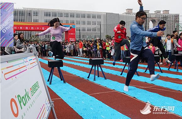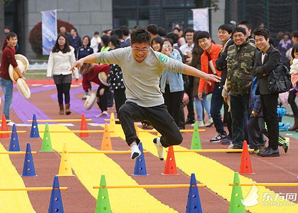 东方网记者刘歆3月19日摄影报道:今天,沪上百余个创客团队的近千名年轻人走出办公室和实验室,相聚宝山体育中心,参加“创客酷跑中国行”上海站活动。在百米的指压板跑道上,创客们5人一组举行接力赛,在健身娱乐的同时,也比拼了团队的和谐与默契。