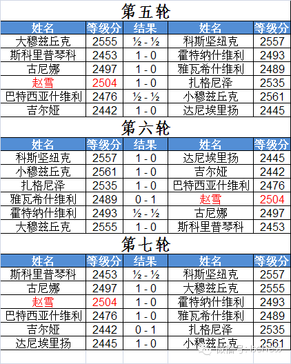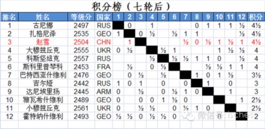 下面是七轮过后的积分榜。踏着连胜脚步,赵雪已经迈入积分榜第一集团。同分的还有俄罗斯的古尼娜和格鲁吉亚的扎格尼泽。