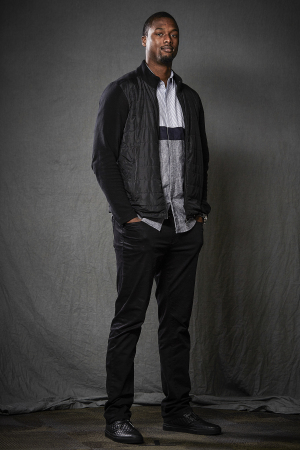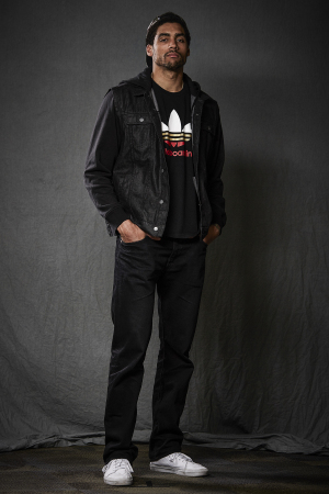 T恤:阿迪;夹克:Rocawear;牛仔裤:李维斯;鞋:万斯;帽:Krate。