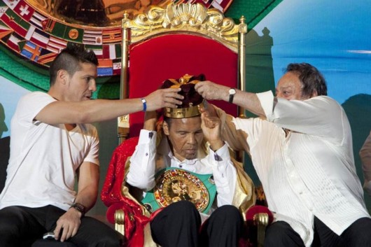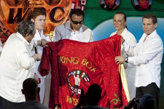 北京时间12月4日,美国拳王阿里在世界拳击理事成立50周年庆典上获颁拳击之王称号,并佩戴王冠。