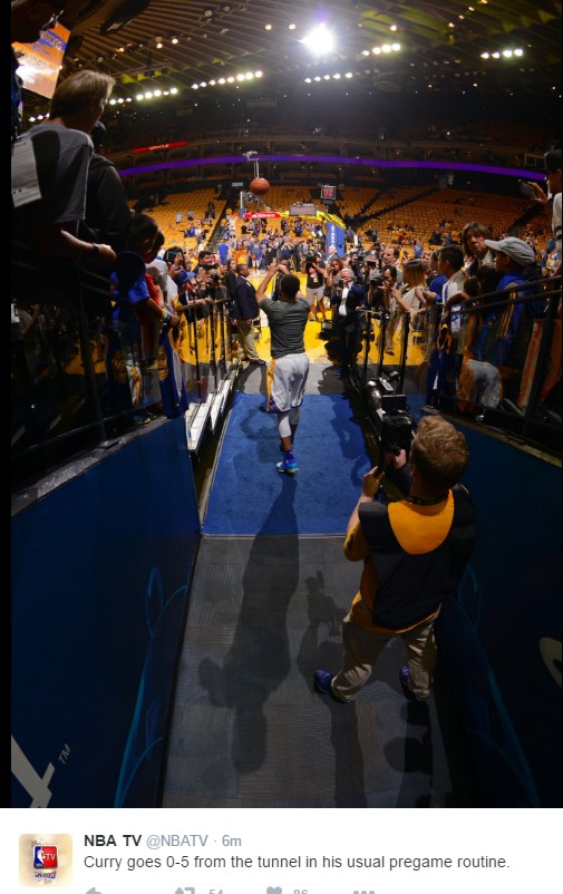 赛前,库里依然按部就班的进行准备,其中就包括人神共知的通道投篮(Tunnel Shot) 。